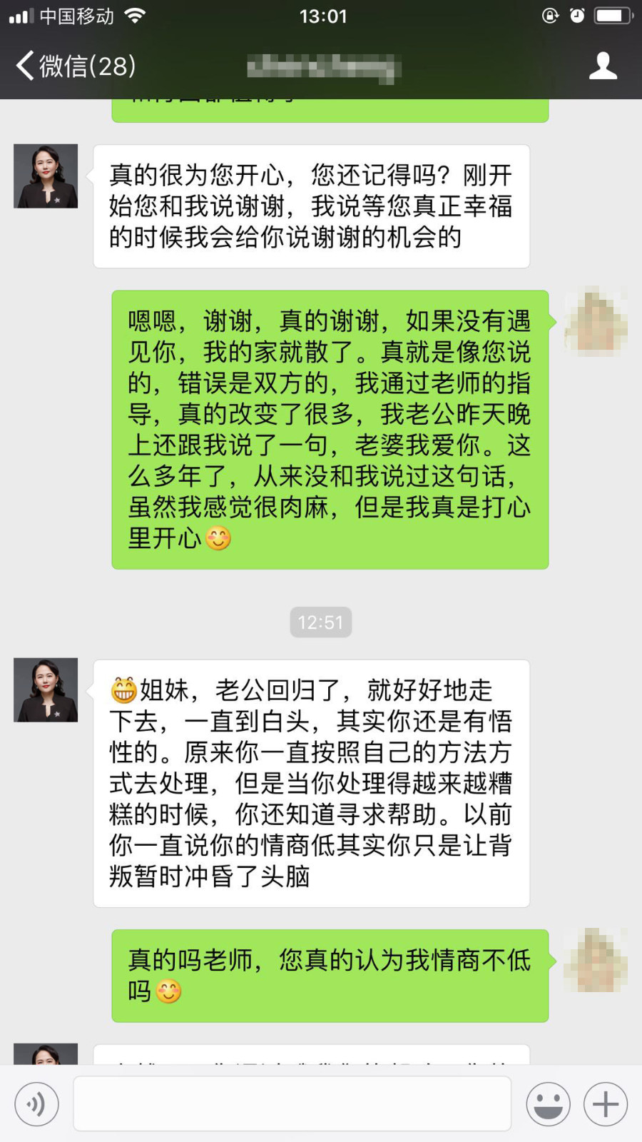 通过陈果老师的帮助,我重拾了对婚姻的信心,也认识到了自己在婚姻里存在的不足,了解到了丈夫和孩子真正的需求。他想要回家能感受到我对他的关心和在乎,而不是一回家就只听我抱怨;我想要他疼我爱我,知道我为这个家的付出,这样我辛苦一点累一点也值得。老师教我两个人怎样好好地心平气和地沟通,那一次把内心里的诉求和委屈都说了出来,通过这次谈话,我们都认识到了彼此对对方的不理解和伤害。